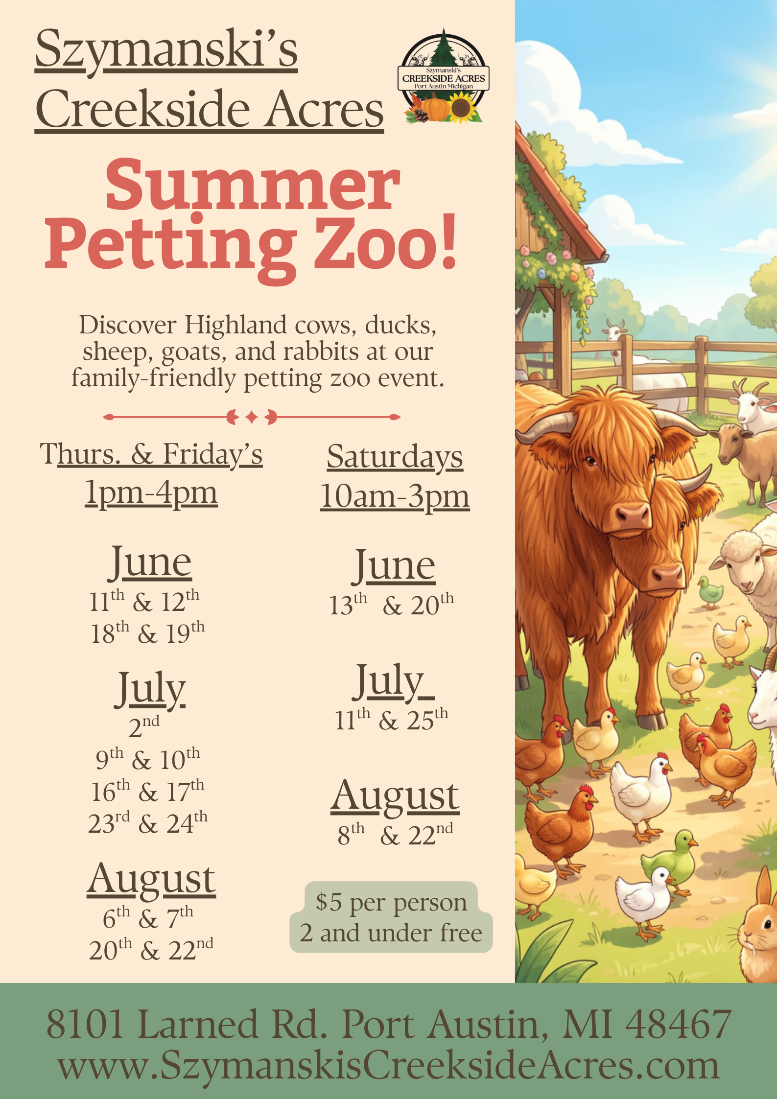 Bring the whole family out to Szymanski’s Creekside Acres Summer Petting Zoo for a hands-on farm experience full of fun, learning, and adorable animals!